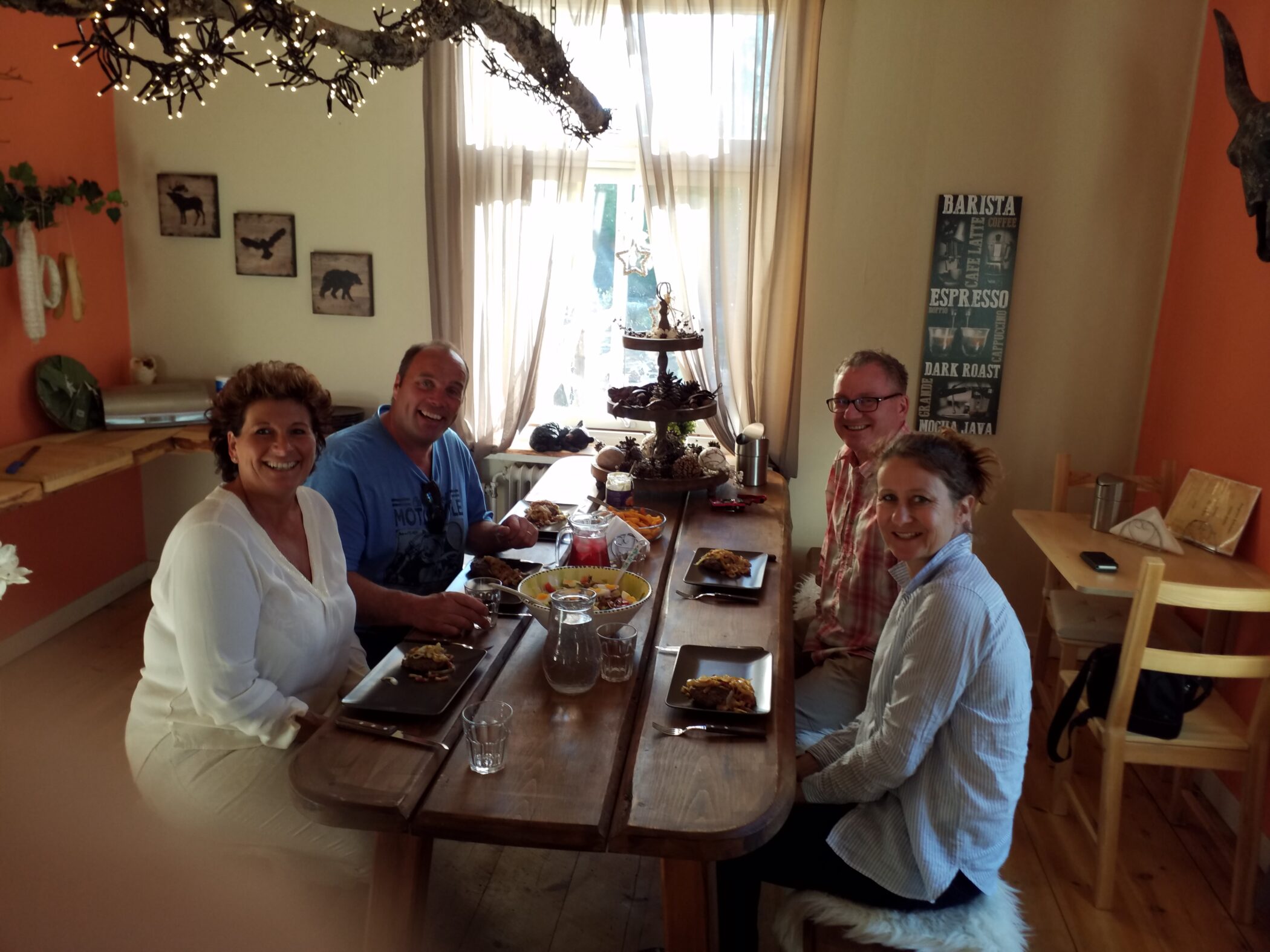 We have a great dinner together that Rolf prepared for us – roast elk with potato gratin. Then we have an evaluation of our entire trip out in the garden with coffee and ice cream!